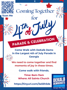 Come celebrate with us at Georgia’s largest Independence Day parade. Bring your friends, wear your Dekalb shirts, anything with family friendly messaging or just blue and let’s show what community democracy look like in action. Click the Image Below to sign up!